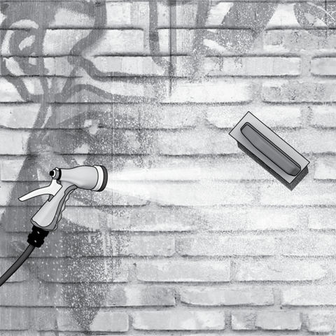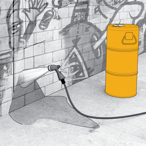 - Le nettoyage ne requiert que de l’eau froide sous une pression de 80 à 100 bars. Le graffiti peut éventuellement être enlevé au moyen d’un tuyau d’arrosage à usage domestique en combinaison avec un chiffon absorbant adapté ou une brosse dure.